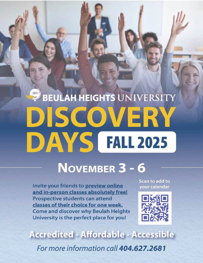 We invite you to explore what Beulah Heights University has to offer by attending our Discovery Days. This event provides a unique opportunity to invite family and friends to experience BHU for free.